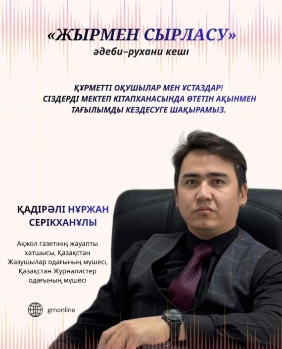 Бүгінгі кешіміздің қадірлі қонағы – өлеңдерімен жүрекке жол таба білген, шығармалары арқылы оқырман сүйіспеншілігіне бөленіп жүрген ақын Қадірәлі Нұржан Серікханұлы.